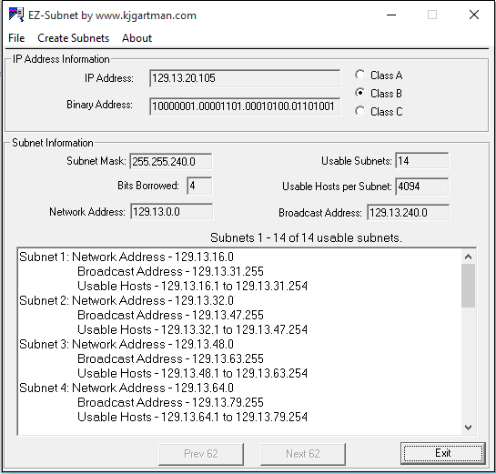 After completing the two-year Cisco CCNA course, I used my programming skills to write this subnet calculator. The program allows the user to enter an IP address and will display the Class (A, B, or C) and the binary representation of that address. The user can then create subnets based on ther number of required hosts, number of required subnets, or by the number of bits 'borrowed' from the original IP address. EZ-Subnet will then display each sub-network address, the broadcast address for each subnet, and the usable host addresses for each subnet.