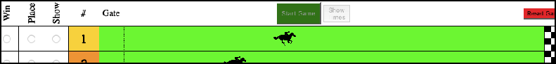 This is horse Racing game based on a dice & board game I received as a gift. I made a few modifications and came up with this game using Javascipt and CSS. Select your horses for Win, Place, and Show. Then, press Start Game. After all the horses arrive at the Starting Gate, the race begins. You can see the value of each 'Dice Roll' during the race or hide the display. With a little problem-solving, I wrote the script so that once a horse has completed the race, that number will not be 'rolled' again, so the whole race takes approximately 90 seconds. When the race is finished, race times will be posted and you will see if any of your picks were winners!